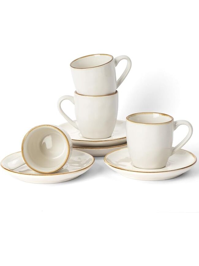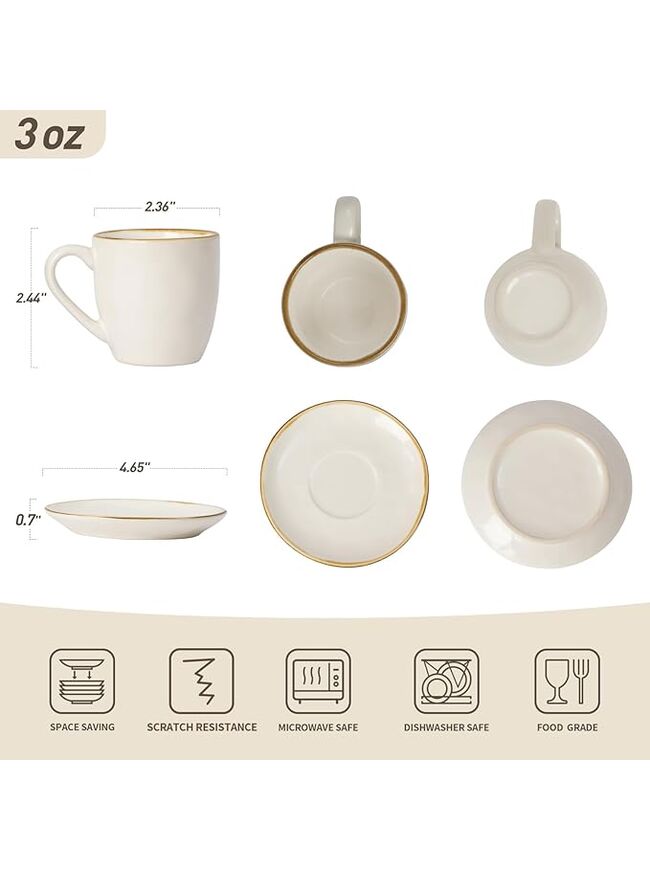 famiware Ocean Espresso Cups with Saucers Set of 4, 3.34oz Espresso Cup Set, Coffee Mug Set for Latte, Macchiato, Stoneware Demitasse Cups Set for Cafe, Microwave&Dishwasher Safe, Vanilla White