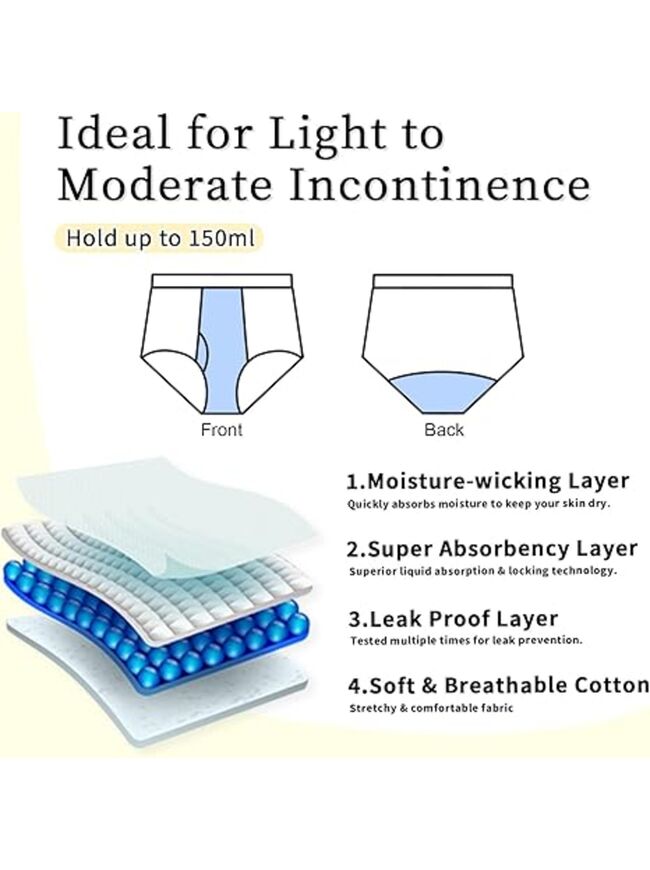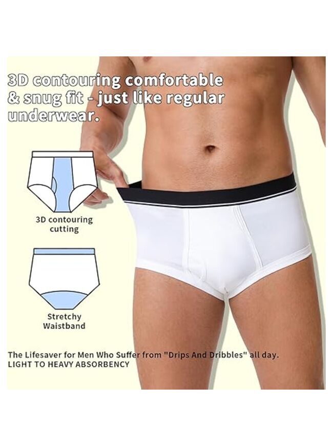 ShieldEase Washable Incontinence Underwear for Men - Cotton Leakproof Briefs with Fly, Front & Rear Urinary Leak Proof Panties, 150ml Absorbency (3 Pack, White, S)