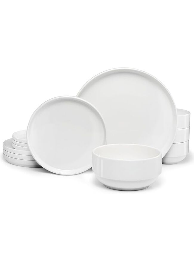 Ceramic Dinnerware Set, 12-Piece Service for 4, Soup Bowls (31.5 oz), Salad Plates (7.5"), Dinner Plates (10.5"), Round, Microwave and Dishwasher Safe, White, Cambridge Classics
