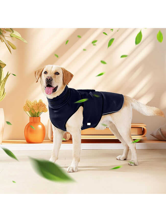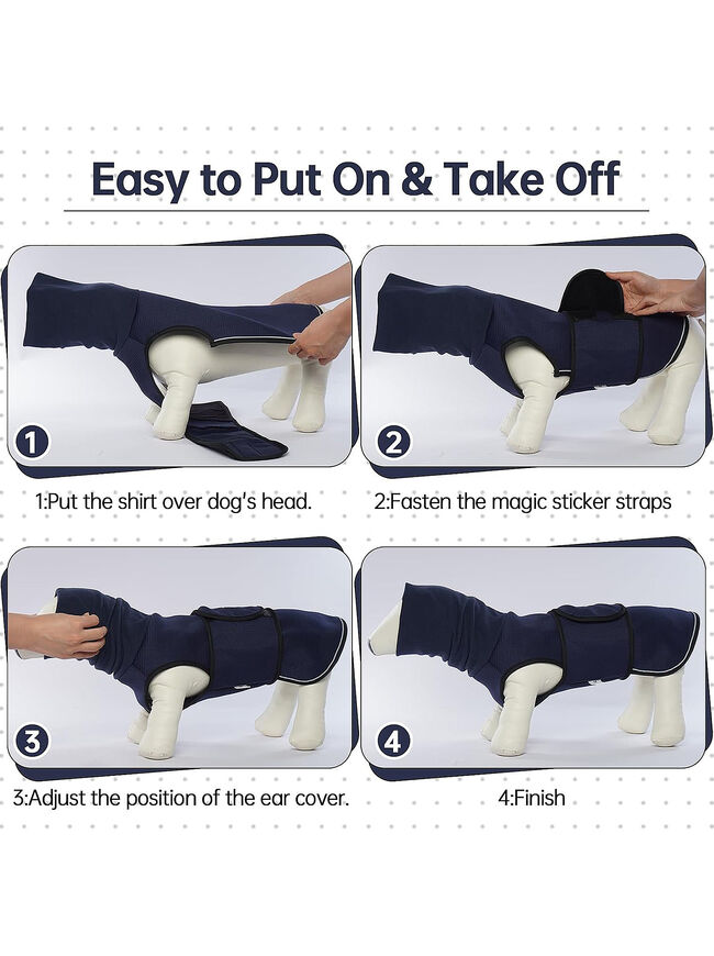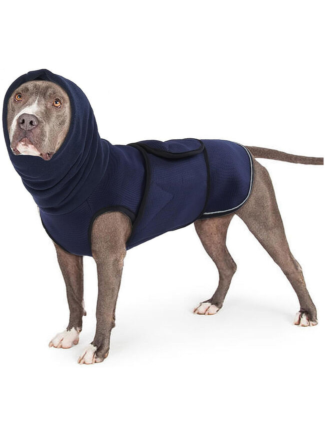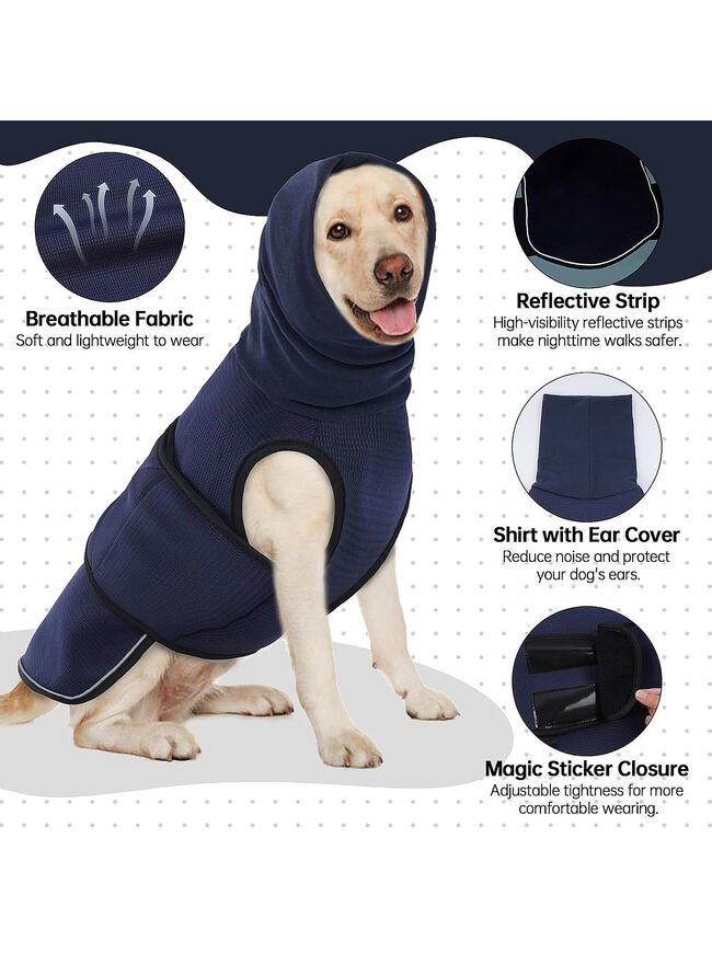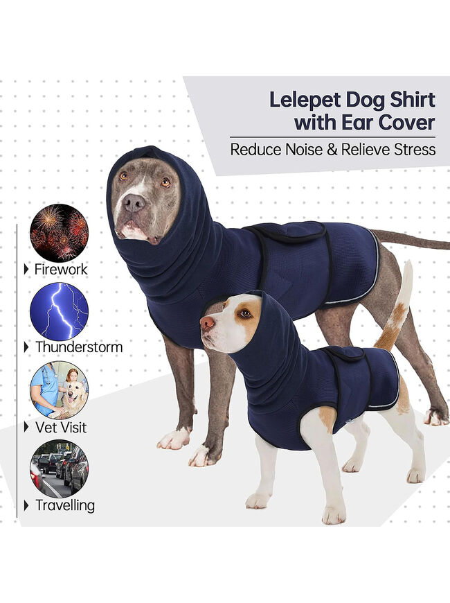 Lelepet XL Navy Blue Dog Shirt: Ear Cover for Anxiety, Calming Hood, Reflective Strips