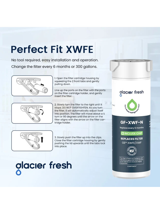 GLACIER FRESH Water Filter Compatible with XWFE (Built-in CHIP), Replacement for GE XWFE, XWF Refrigerator Water Filter NSF/ANSI 42 Certification Choose Pack Size